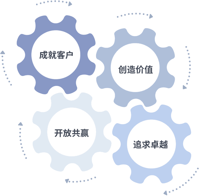 成就客户是一切决策的出发点,,,,创造价值是衡量所有工作的标准,,,追求卓越是CA88集团做事做人的态度,,,,开放共赢是CA88集团的格局也是最终的结果。。。。价值观的齿轮环环相扣,,推动着组织里的每个人不断向前。。